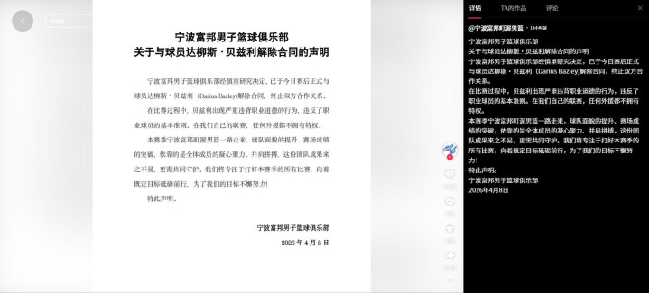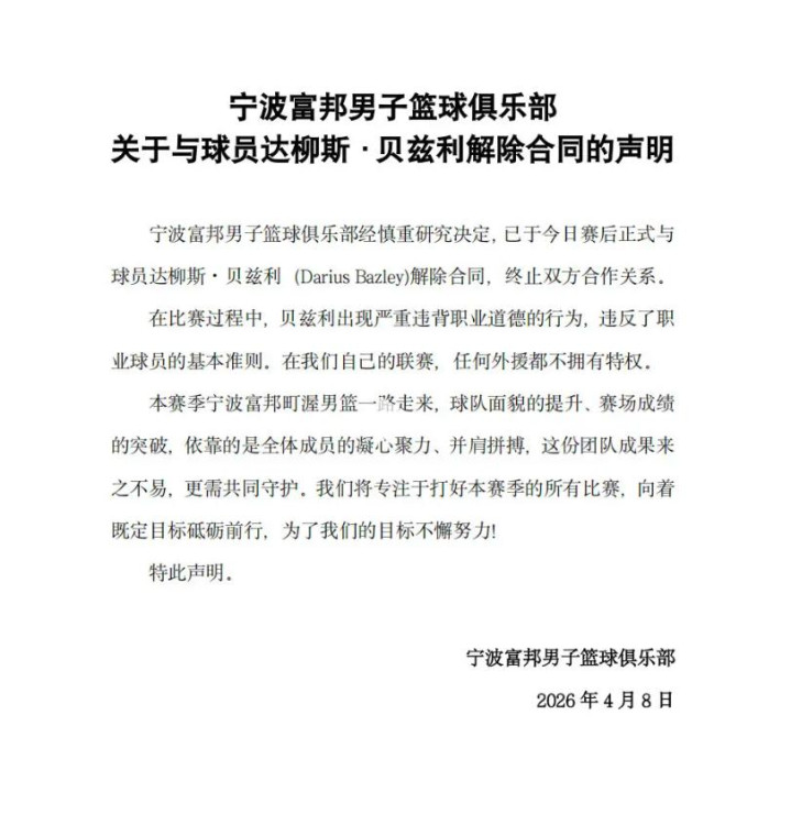 比赛实现后不到一小时,宁波富邦男篮火速发布官方声明,文告与达柳斯·贝兹利肃肃撤废条约,圮绝系数合营相干。