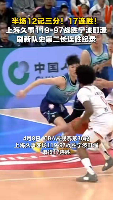 4月8日晚,CBA成例赛第36轮焦点战,上海久事客场119-97大捷宁波町渥,豪取17连胜,刷新队史第二长连胜记录,仅次于2001-2002赛季的23连胜。