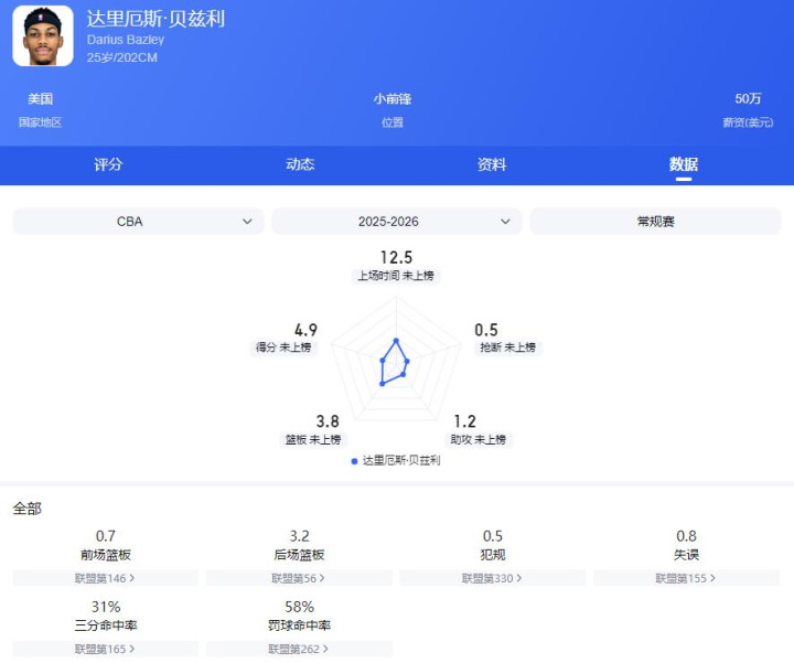 贝兹利12场比赛场均仅出战12.4分钟,孝敬4.9分3.8篮板,投篮掷中率44.4%,三分掷中率31.3%,数据全面低迷,致使不如队里的年青原土球员。