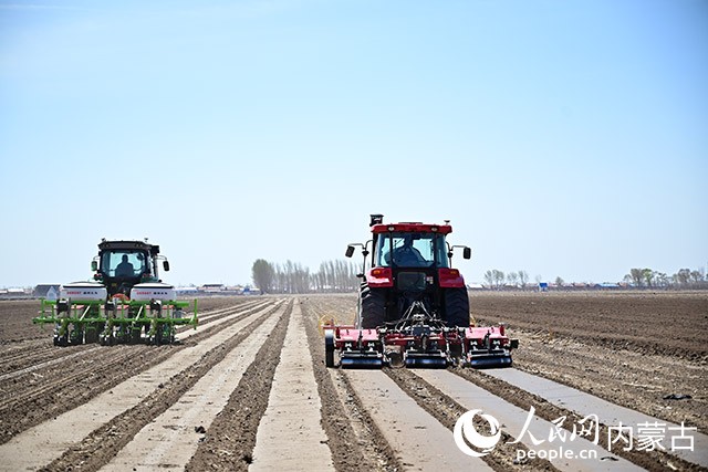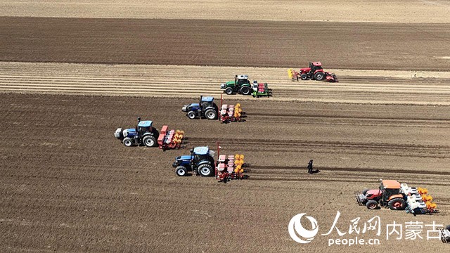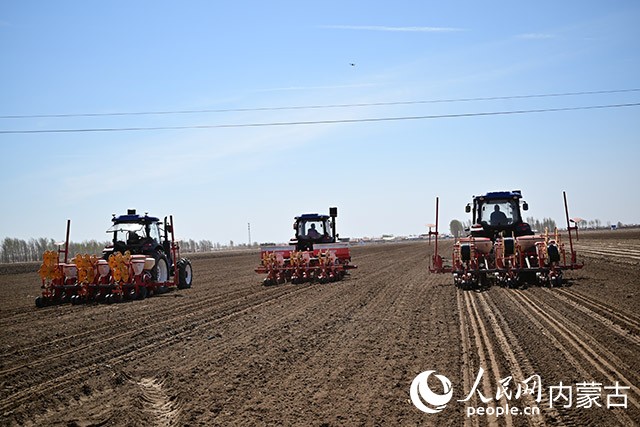 科尔沁区丰田镇常家围子村用农耕机械车播种玉米种子。通辽市融媒体中心供图
