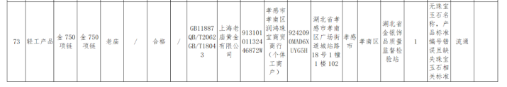抽检效果显现,1批次标称孝感市孝南区润鸿珠宝商贸商行(个体工商户)受检的“老庙金750项链”被检出永诀格,永诀格技俩为无珠宝玉石称号,家具设施编号无理且缺失珠宝玉石关系设施,出产企业为上海老庙黄金有限公司。
