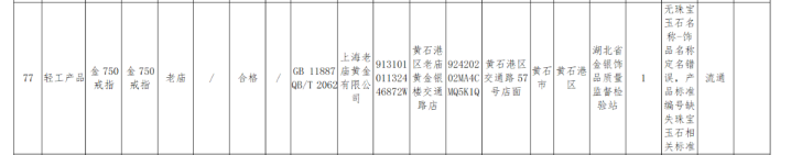 1批次标称黄石港区老庙黄金银楼交通路店受检的“老庙金750限制”被检出永诀格,永诀格技俩为无珠宝玉石称号-饰品称号命名无理,家具设施编号缺失珠宝玉石关系设施,出产企业为上海老庙黄金有限公司。